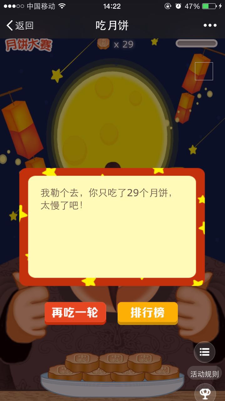 针对每年中秋节开发的吃月饼游戏,游戏参与简单,有特色,老少咸宜,果断是中秋节宣传营销的好功能!