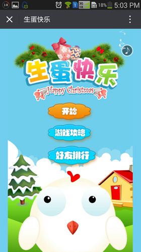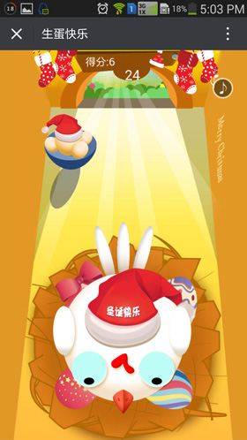 圣诞快乐之生蛋快乐,一只可爱的母鸡下蛋了,玩家可以用手指向上滑动来控制母鸡下蛋,看谁在规定的时间内下的蛋多,谁就能获得好的排行,得到相应的奖品!